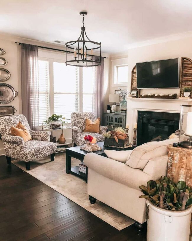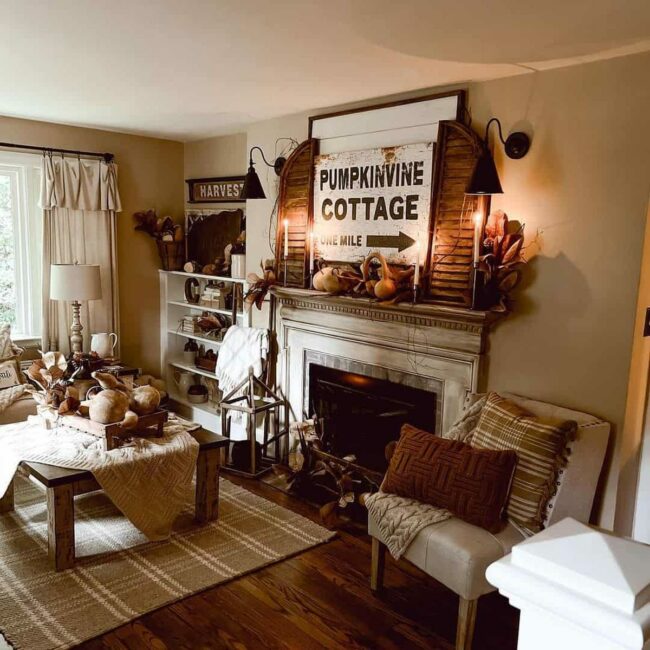 Rustic touches like woven throws, ceramic pumpkins, and copper accents enhance the room's seasonal mood.