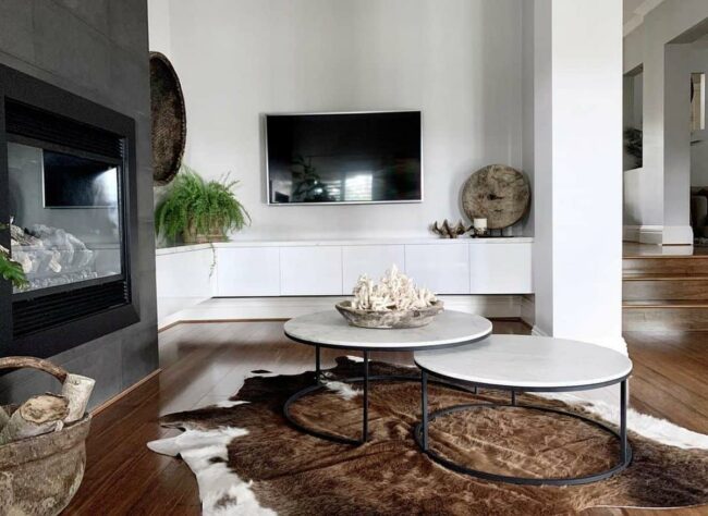 Unique rugs with unexpected shapes create visual intrigue while defining space boundaries.