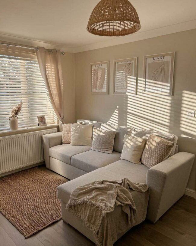 Sunlight cascades through white blinds, bathing a living room in soothing warmth and highlighting natural textures like a rattan light fixture and woven rug.