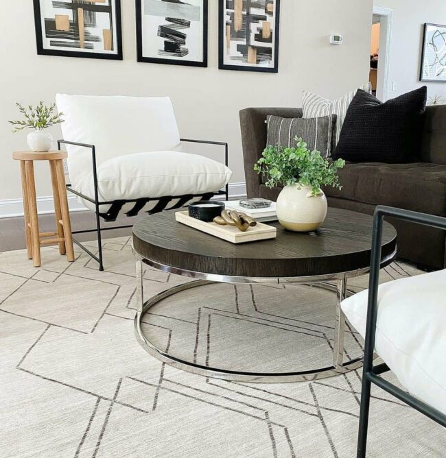 Natural wood coffee tables with metal accents anchor the room, complemented by a sophisticated ivory area rug that adds warmth and texture.