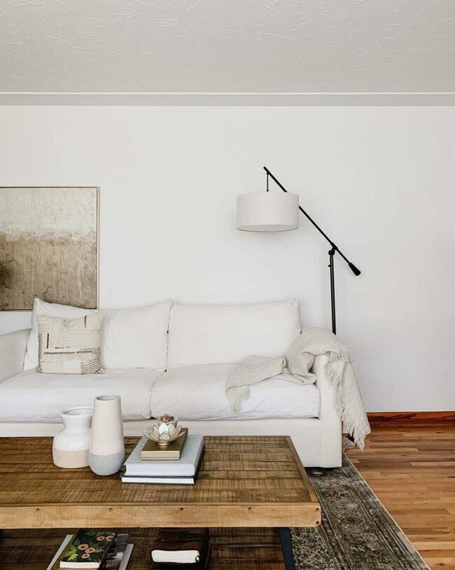 White surfaces like the coffee table create perfect display areas for artistic decor pieces.