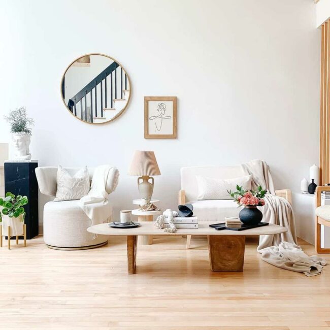 Organic coffee tables with unique shapes connect the space to natural elements, creating an effortless flow.