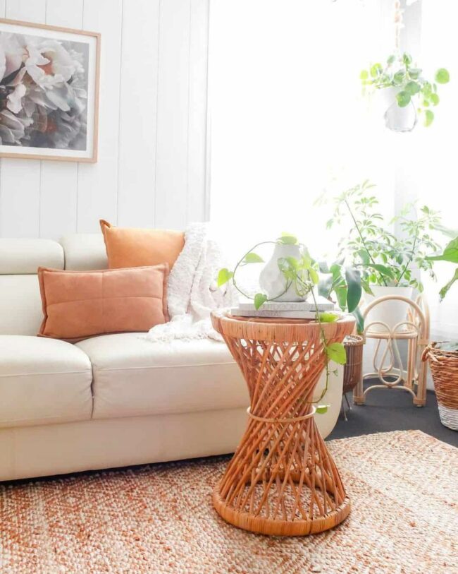 Rattan stands with spiral weaves draw immediate attention in living spaces, perfectly pairing with ivory couches and warm orange pillows.