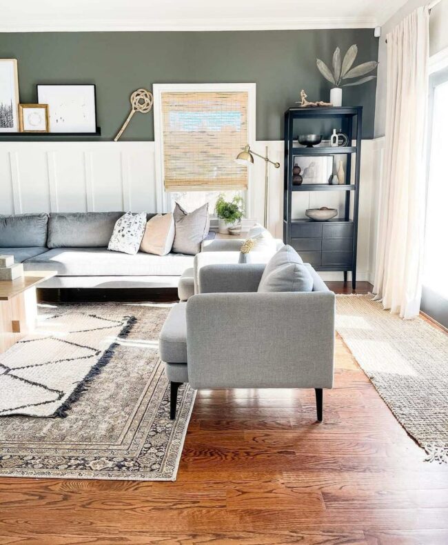 Light hardwood floors provide a neutral foundation, softened by a plush gray area rug that connects each design element.