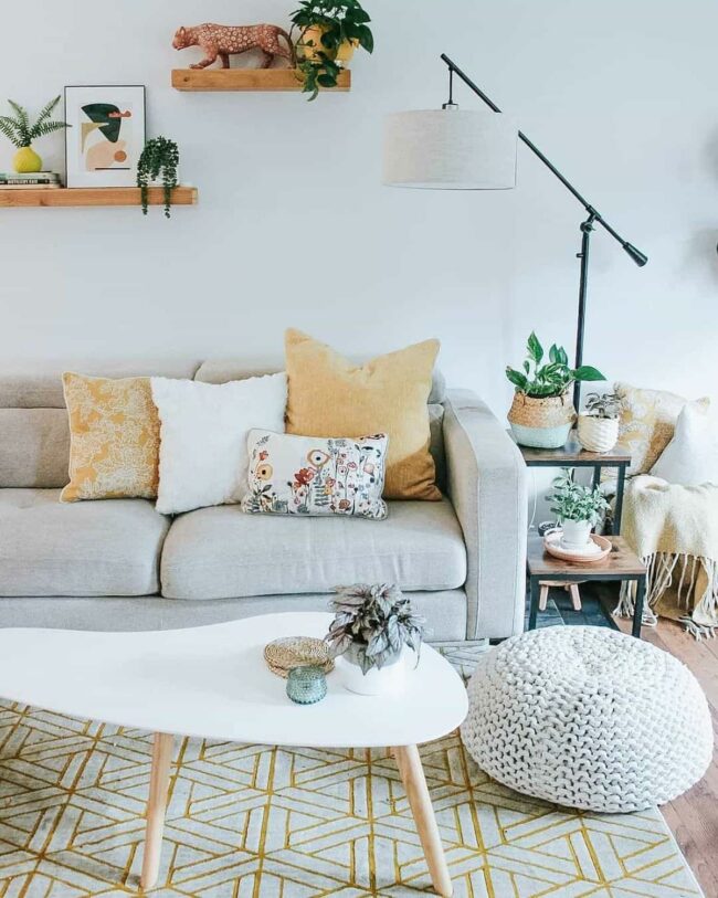Neutral gray sofas adorned with playful yellow and white pillows welcome warmth and visual interest.