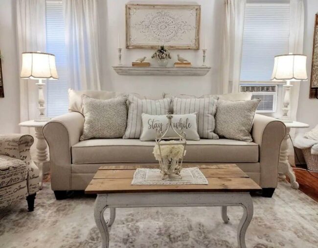 Relaxation flows through this charming living room, where a rustic wooden farmhouse coffee table anchors the inviting space.