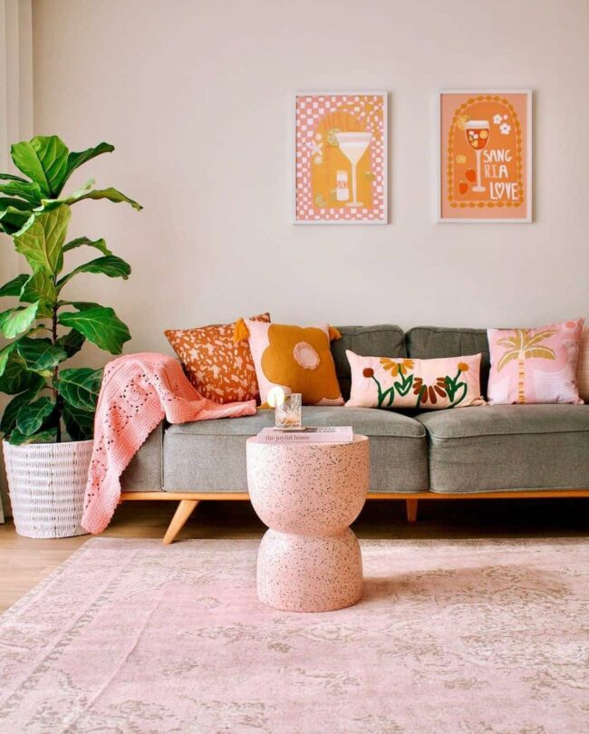 Blush pink dances alongside vibrant orange, creating a striking contrast against the expansive gray sofa dominating the space.