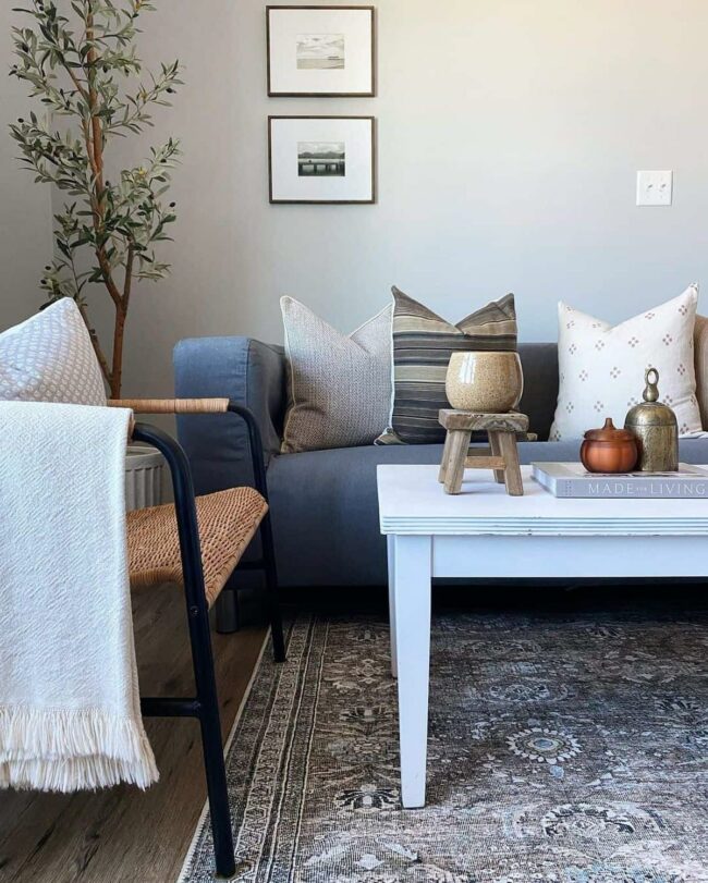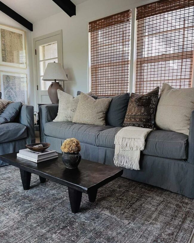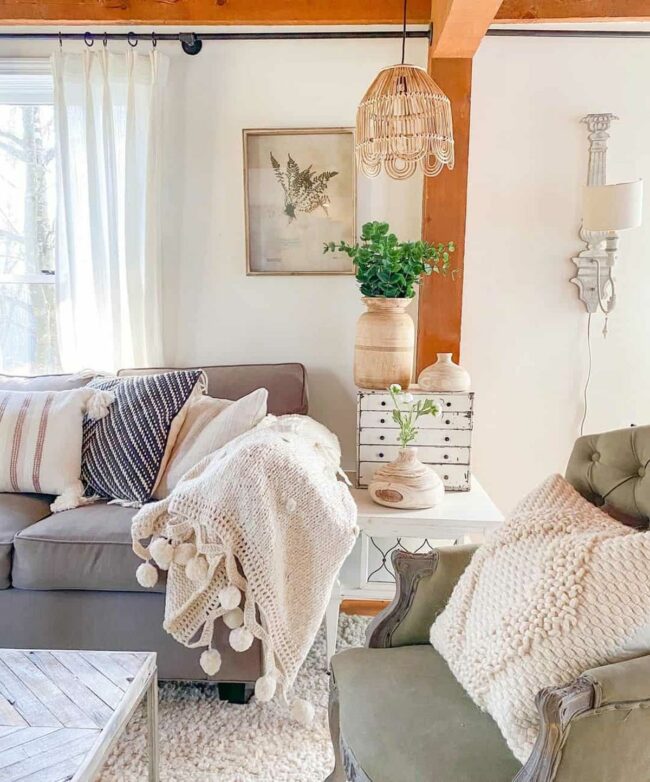 Textural elements like woven blankets and weathered wood add depth to your living space.
