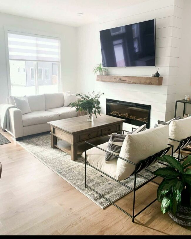 Elegant white shiplap surrounds the fireplace, its floating wood mantel adding warmth and character to the area.