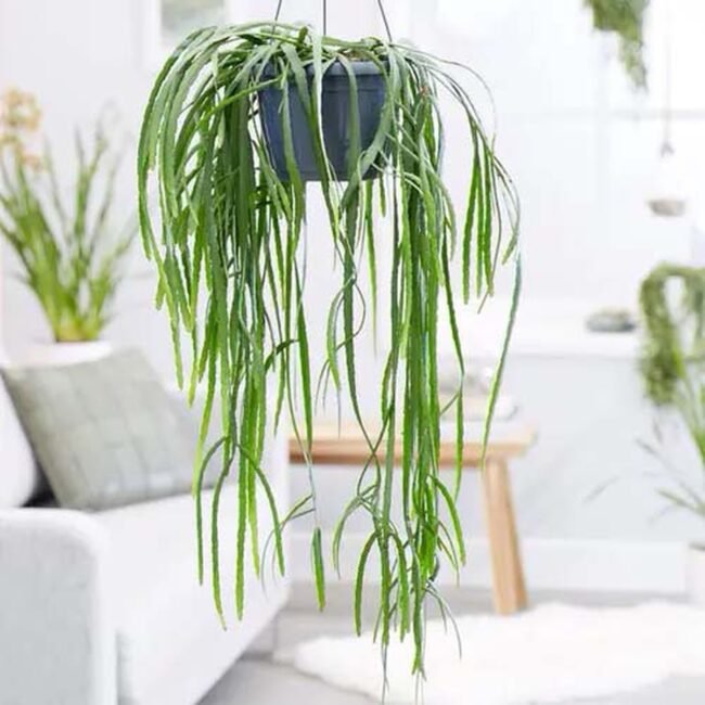 Native to Brazilian rainforests, forest cactus (Rhipsalis) stands out from desert-dwelling counterparts with delicate, cascading stems that drape elegantly from hanging planters.