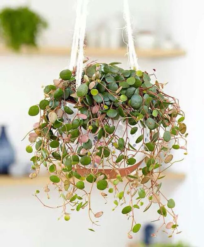 String of nickels, a captivating indoor vine, delights plant enthusiasts with its distinctive coin-shaped leaves that elegantly cascade from hanging pots.
