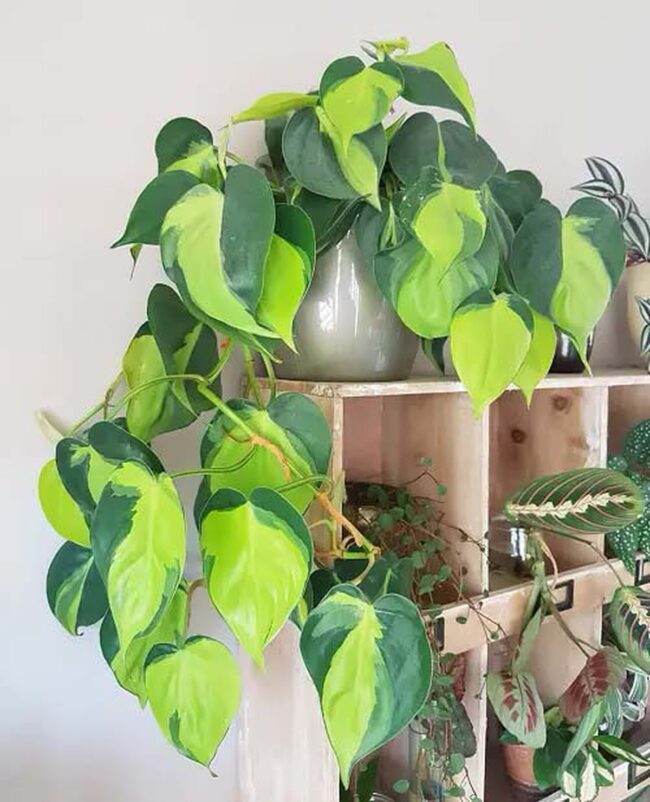 Pothos plants make excellent indoor companions with their lush, trailing green leaves that drape elegantly from shelves and trellises.