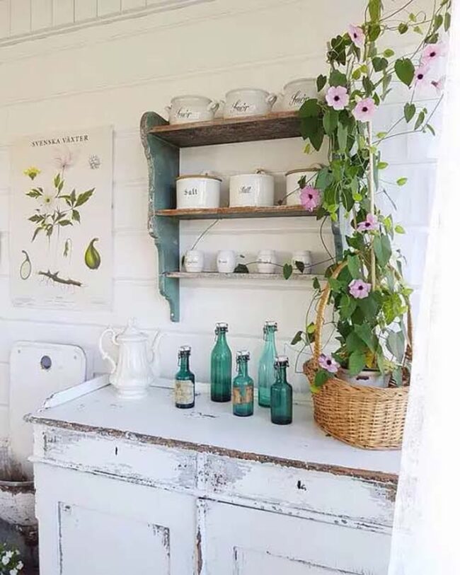 Green trailing vines cascade elegantly across shelves and side tables, creating a natural aesthetic without consuming excessive room.