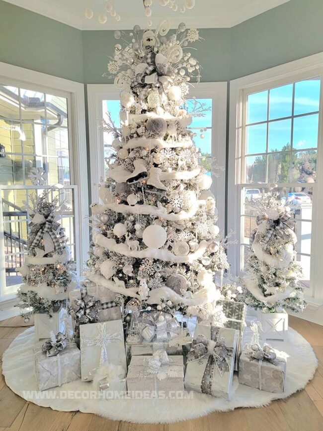 Crisp white Christmas trees draped with delicate silver ornaments and crystal accents capture attention with their sophisticated charm.