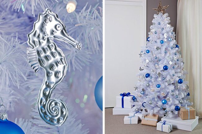 Silver and blue ornaments swirl delicately across pristine branches, creating a dreamy coastal landscape that feels both festive and fresh.