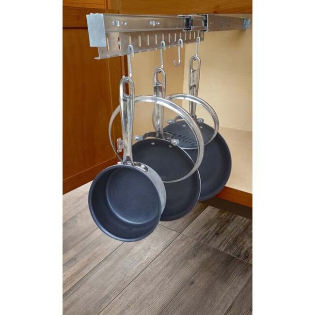 Professional designers recommend measuring cabinet dimensions carefully before selecting a pull-out pan storage system to guarantee a perfect fit.