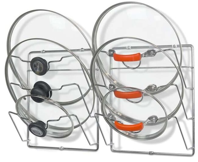 Mounted inside cabinets or drawers, these holders keep lids securely positioned and instantly accessible during meal preparation.