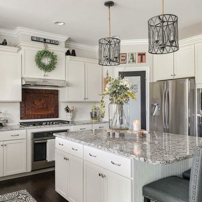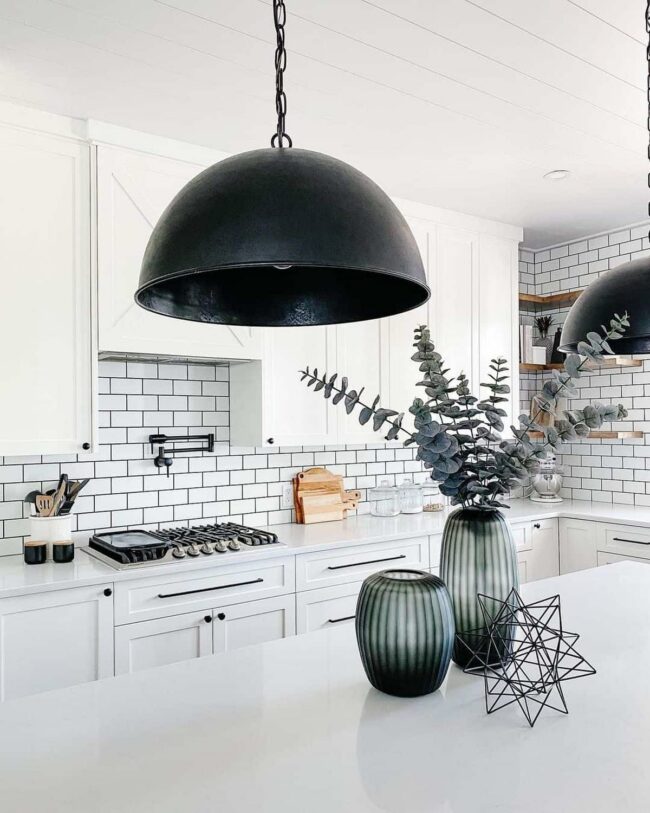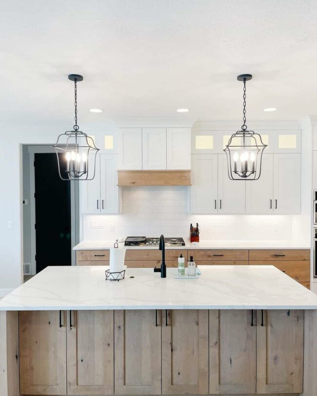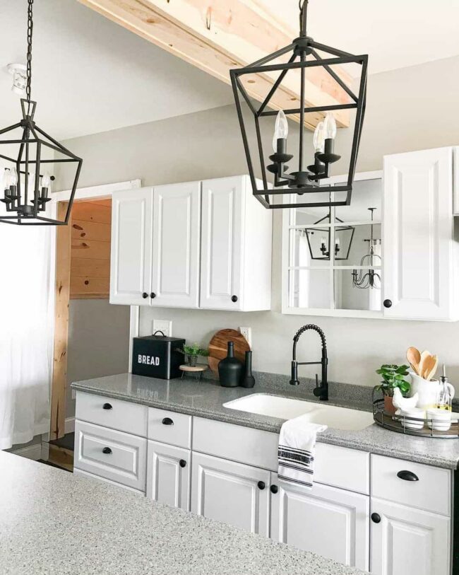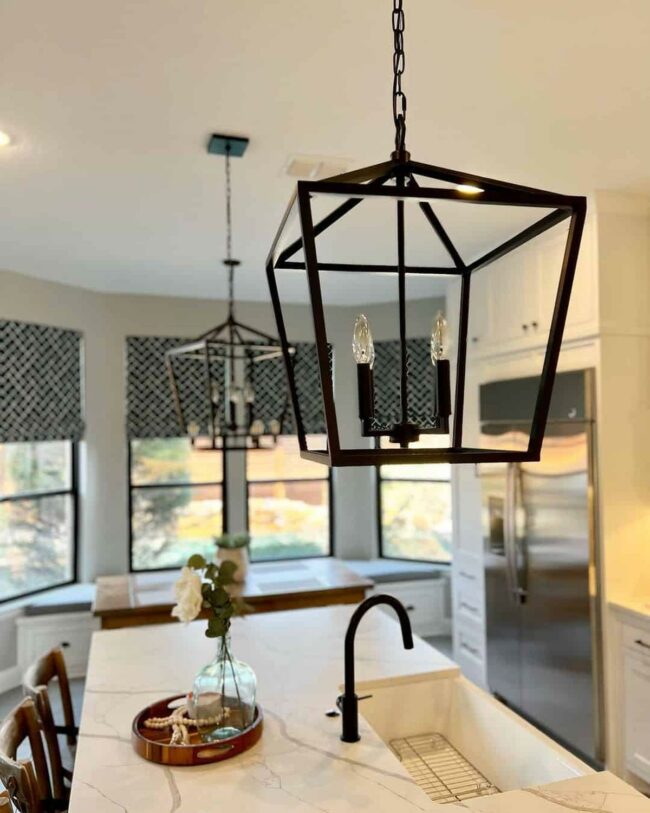 Black lantern pendants grace the area, perfectly complementing crisp white cabinets and backsplash.