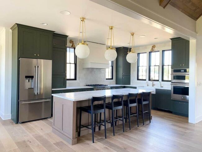 Matte gray cabinets and gold pendants create a stunning kitchen sanctuary where rustic charm meets modern design.