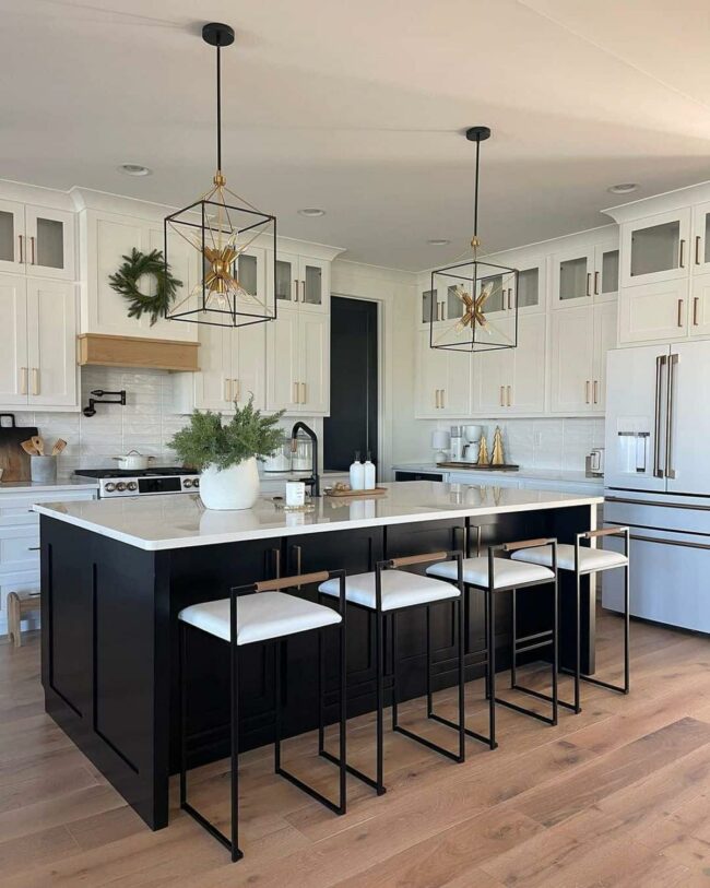 Black kitchen islands make bold statements in modern farmhouse designs, commanding attention with their dramatic presence against warm wood floors.