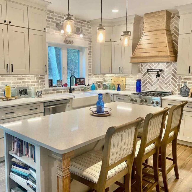 Kitchen design reaches new heights with faux brick walls that radiate rustic farmhouse charm and modern elegance.