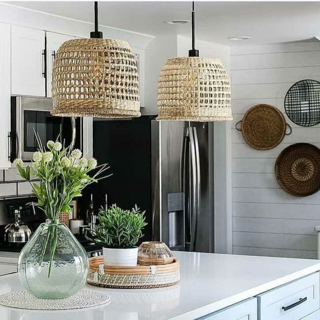 Boho Woven Pendants Illuminate Shiplap Kitchen