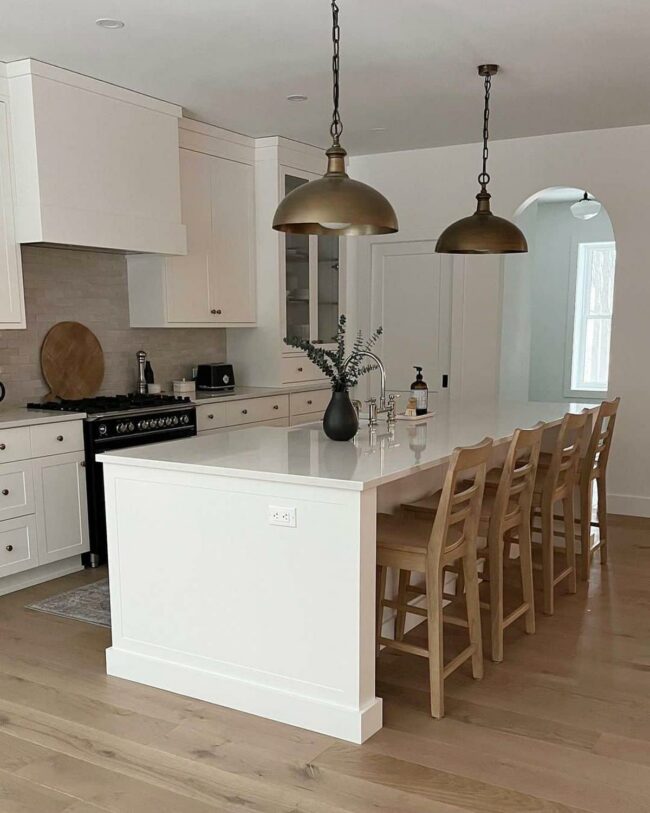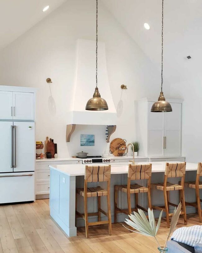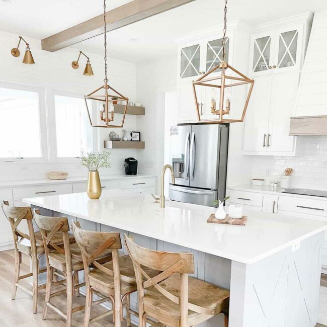 Kitchen spaces burst with character when brass pendants hover above a spacious white island, creating an irresistible blend of rustic warmth and modern elegance.