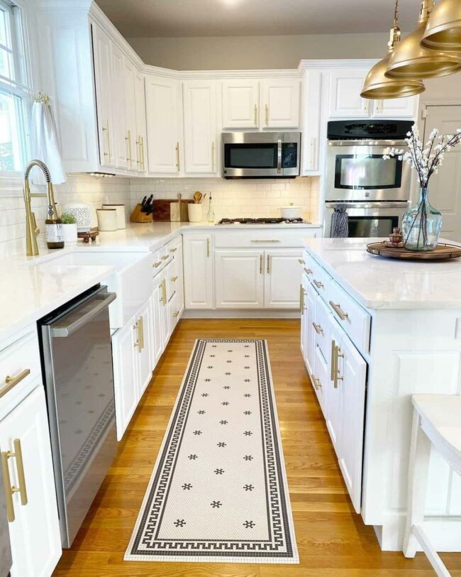 Gold hardware sparkles against crisp white cabinets, instantly elevating kitchen design with luxurious charm.