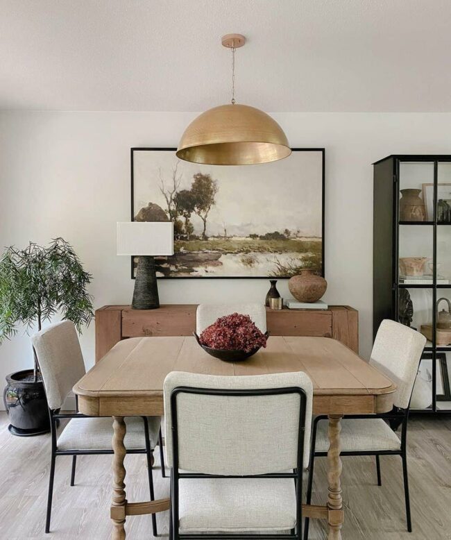 Brass pendant lights cast a warm, inviting glow over a square wooden table that anchors the room's design.
