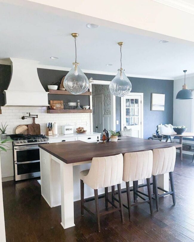 White islands topped with rich butcher block create stunning visual drama against hanging glass teardrops.