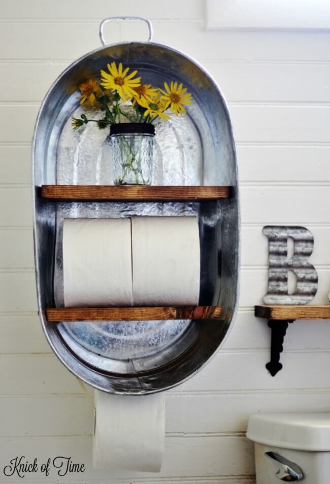Rustic bathroom shelves crafted from an old washtub create a stunning focal point that instantly upgrades your space.