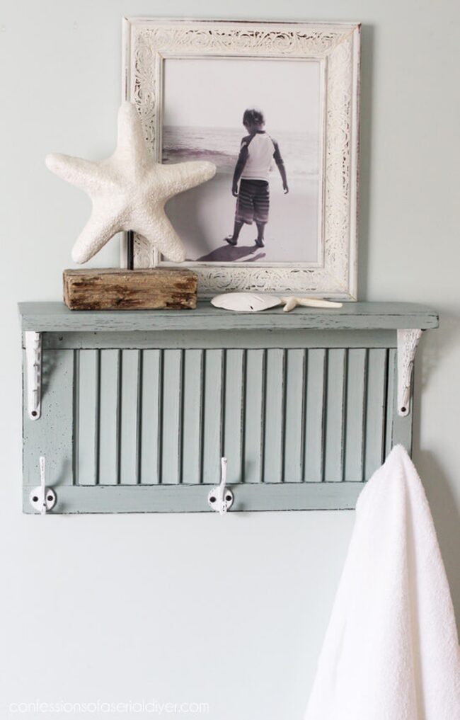 Vintage cottage doors become magical bathroom shelves that maximize space with rustic elegance.