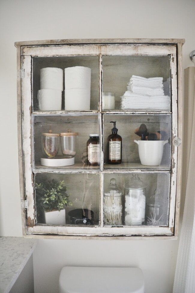 Vintage cabinets offer remarkable opportunities to store towels, toiletries, and personal care items with rustic elegance.