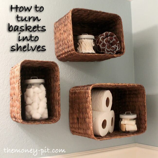 Repurposed baskets bring nostalgic character to bland walls while solving storage challenges.