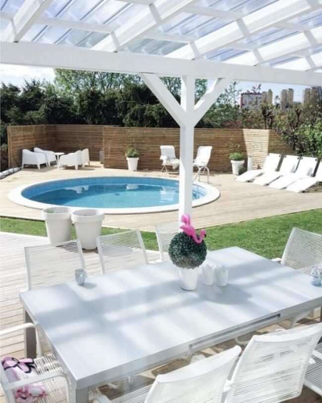 Transparent roofing shelters the dining area, allowing sunlight to dance across surfaces and create an enchanting atmosphere for outdoor meals.