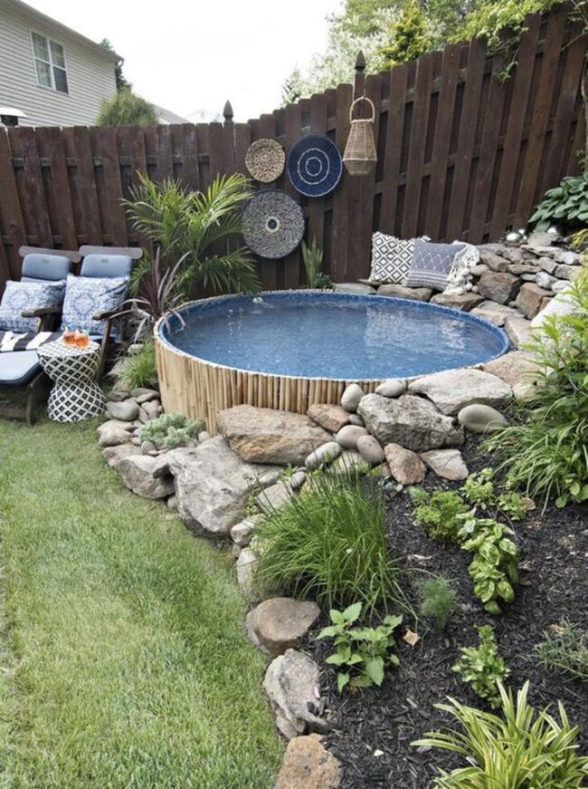 Discover a backyard paradise where your round pool develops a natural sanctuary, effortlessly blending with surrounding greenery through smooth stones and earthy bamboo panels.