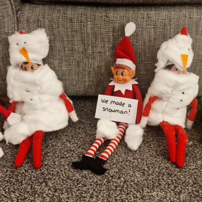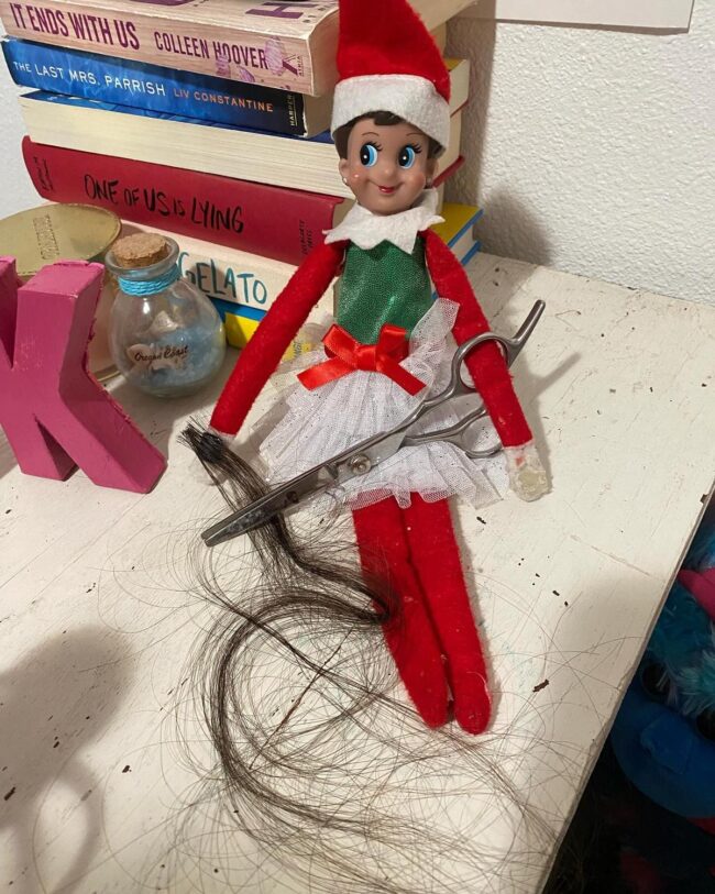 Deck out your elf on the shelf with a hilarious hair salon adventure that'll make everyone chuckle! Tiny scissors and colorful yarn strands become magical props for your mischievous little friend's styling session.