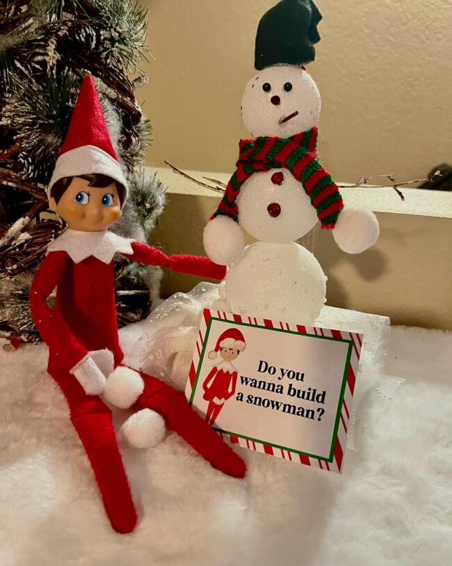 Your holiday elf becomes a magical maestro of winter wonder, perched playfully beside a charming miniature snowman dressed in quirky accessories.