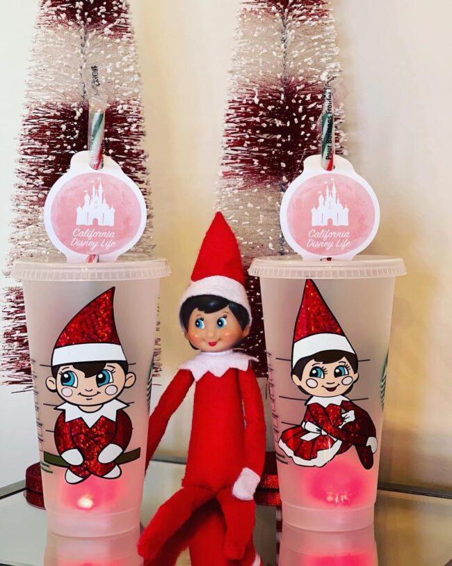 Starbucks cups become charming stages for mischievous characters positioned between sparkling red trees, catching every eye in the room.
