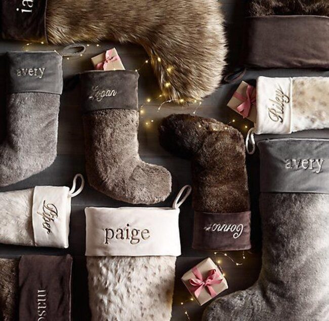Holiday stockings shine as festive focal points, drawing eyes with personalized embroidered names dancing across soft cuffs in gentle earth-tone shades.