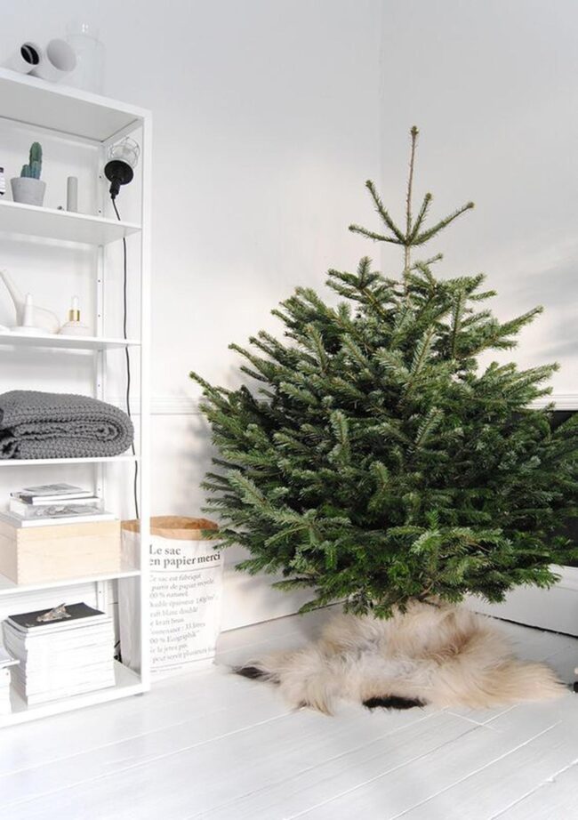 Gray blankets draped casually on shelves whisper quiet elegance, while fluffy natural-toned rugs nestle around your tree like gentle embraces.