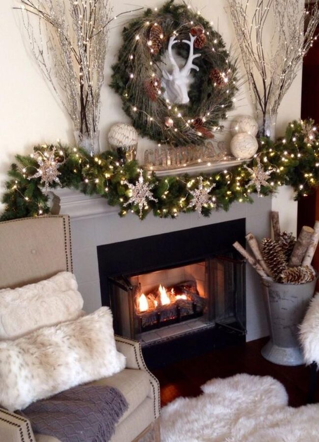 Soft fluffy pillows invite relaxation on nearby chairs while glittery silver branches sparkle in clear glass vases beside a softly glowing fireplace.