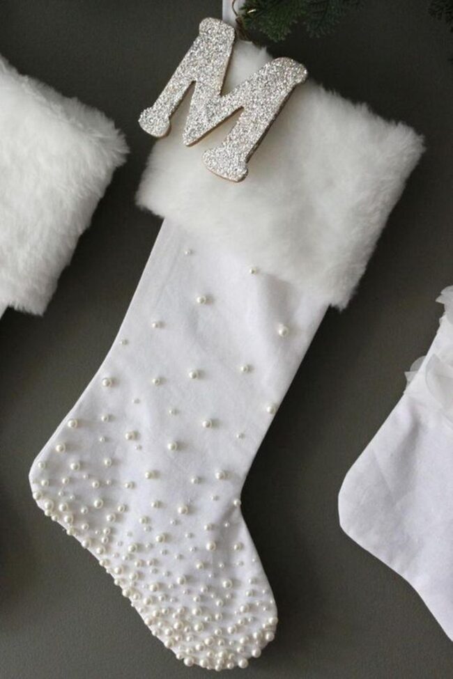 Pearl-adorned Christmas stockings bring magic to holiday decor with their sophisticated charm.
