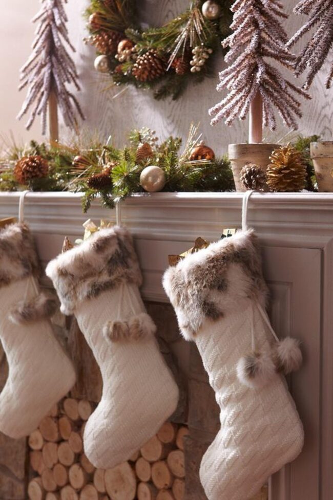 Soft white stockings cascade gracefully from rich wooden mantels, bringing instant cheer and festive spirit to your room.