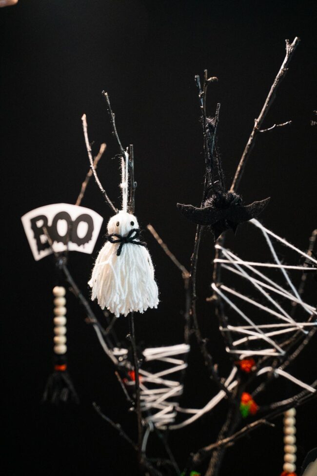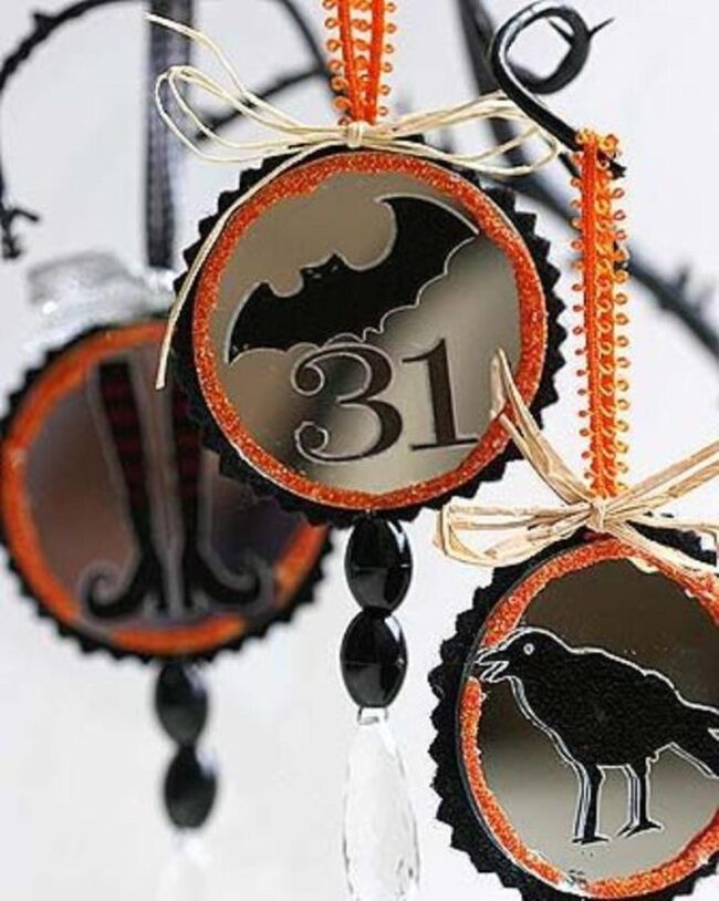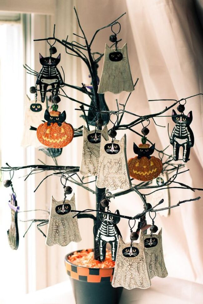 Delicate ornaments featuring witches, ghosts, pumpkins, and black cats can dance from strings, creating an instantly festive atmosphere that feels both playful and sophisticated.