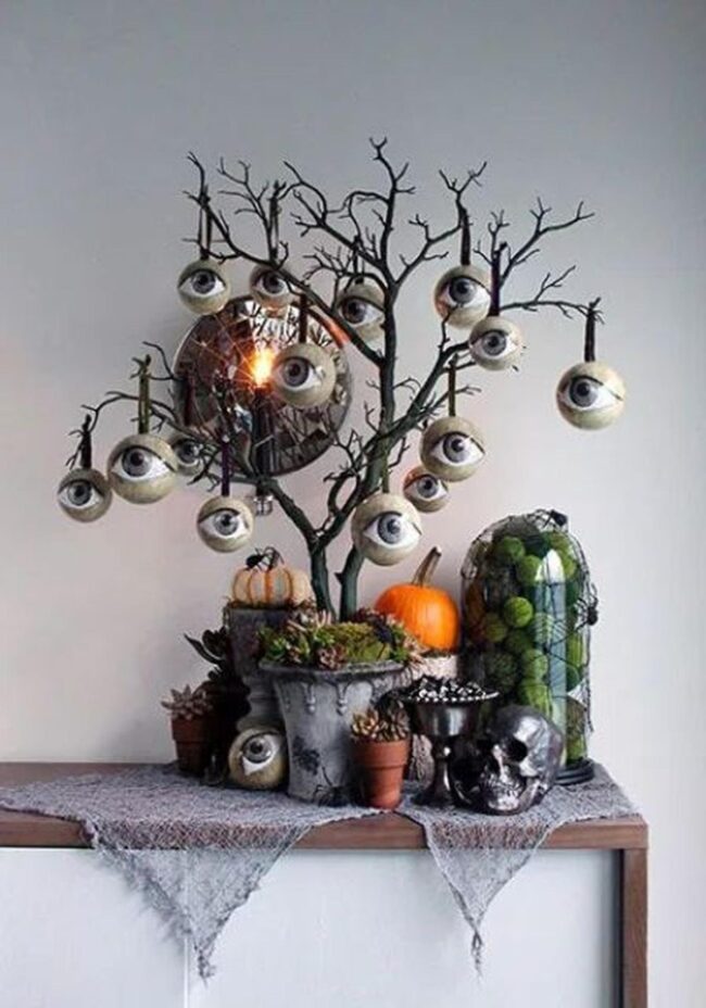 Haunting seasonal displays burst with personality when mixing unconventional elements like mysterious branches adorned with quirky eyeball ornaments.