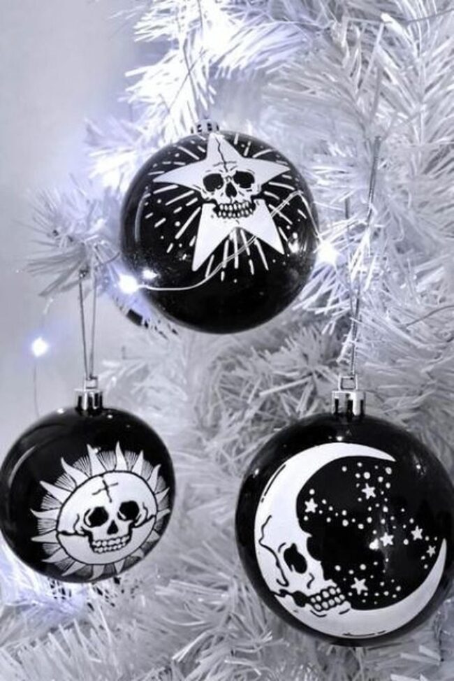 Midnight-colored spheres showcase artistic skull motifs nestled within celestial symbols like shimmering stars and crescent moons, adding unexpected drama to seasonal displays.