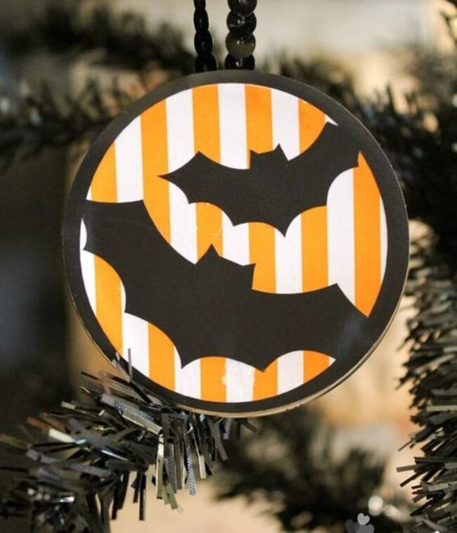 Clever bat silhouettes dance against crisp orange and white stripes, breaking traditional seasonal color rules while capturing eye-catching drama.
