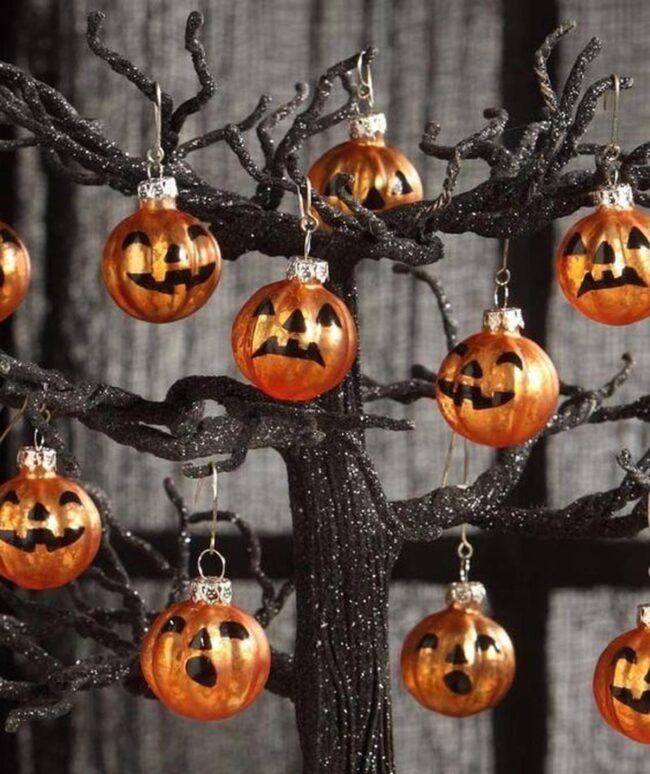 Delicate orange pumpkin ornaments swing from twisted limbs, each sporting uniquely carved faces that range from charmingly goofy to wonderfully wild.