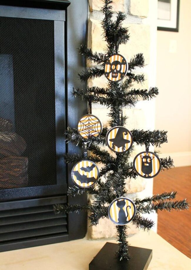 Sharp black branches gleam with perfectly placed ornaments featuring charmingly quirky characters like witchy silhouettes and grinning feline friends.